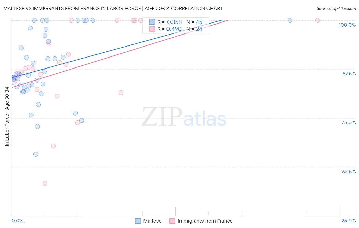 Maltese vs Immigrants from France In Labor Force | Age 30-34 Correlation Chart