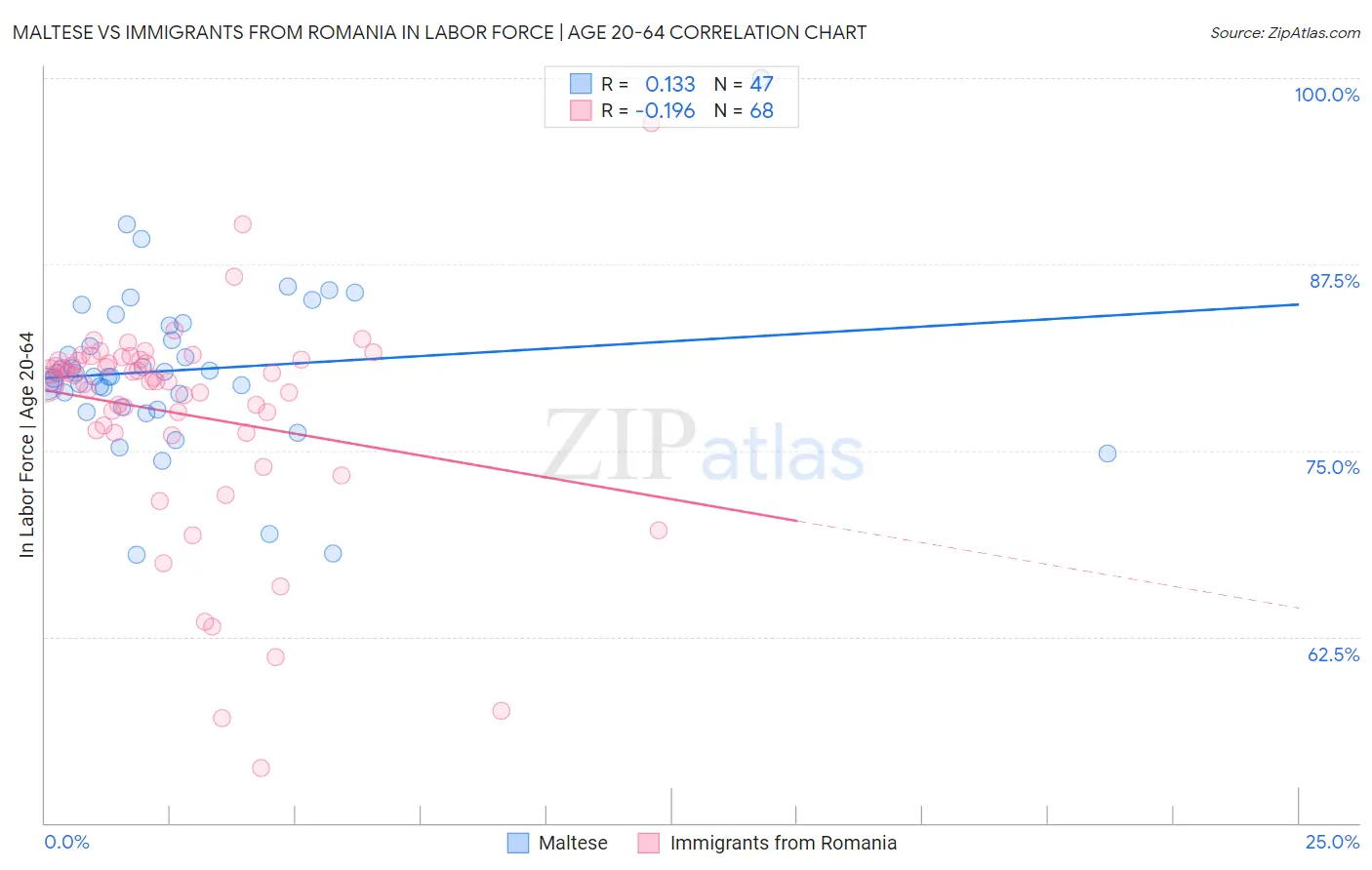 Maltese vs Immigrants from Romania In Labor Force | Age 20-64 Correlation Chart
