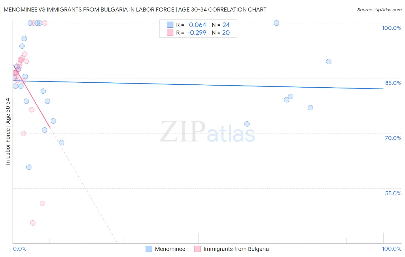 Menominee vs Immigrants from Bulgaria In Labor Force | Age 30-34 Correlation Chart