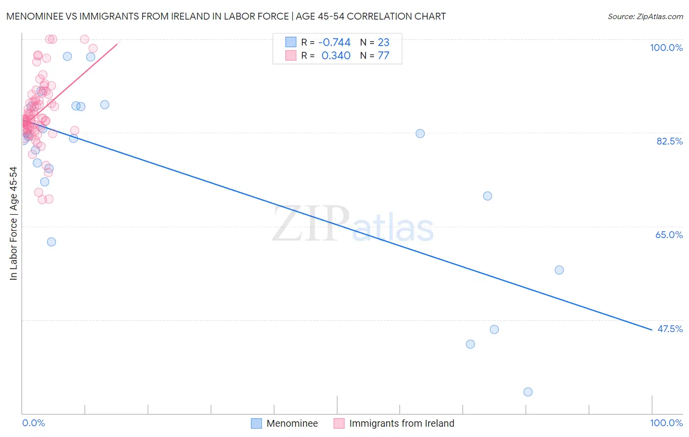 Menominee vs Immigrants from Ireland In Labor Force | Age 45-54 Correlation Chart