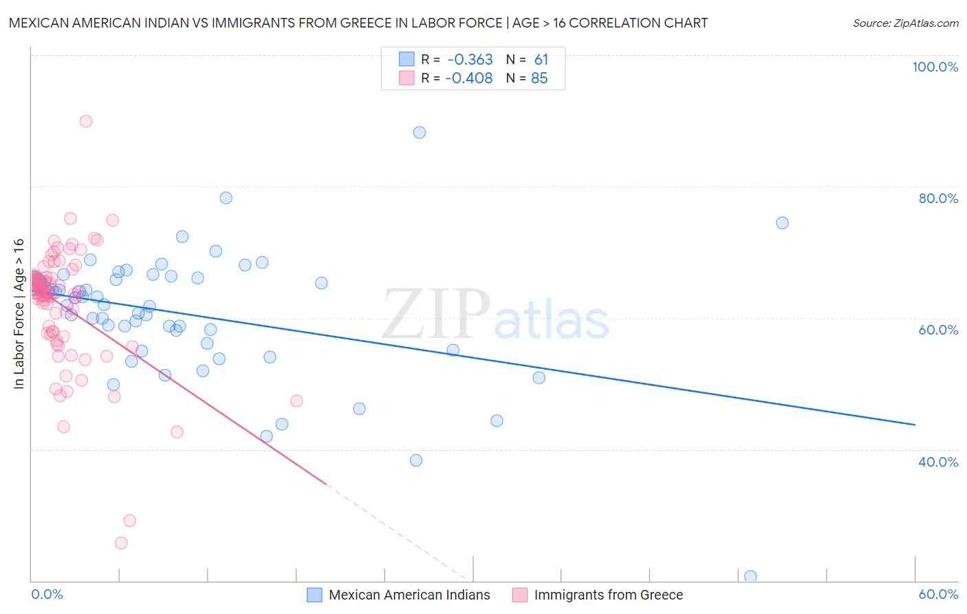 Mexican American Indian vs Immigrants from Greece In Labor Force | Age > 16 Correlation Chart