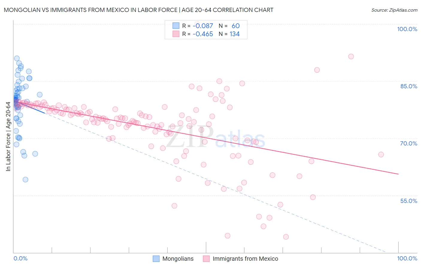 Mongolian vs Immigrants from Mexico In Labor Force | Age 20-64 Correlation Chart