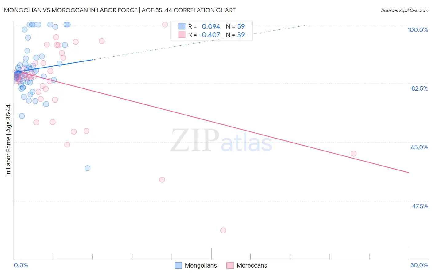 Mongolian vs Moroccan In Labor Force | Age 35-44 Correlation Chart