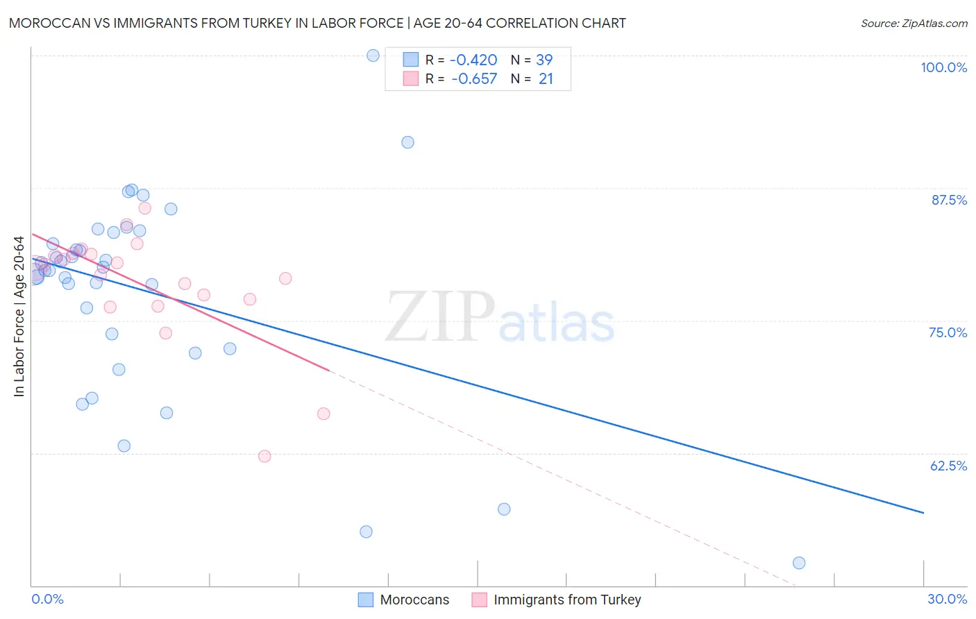 Moroccan vs Immigrants from Turkey In Labor Force | Age 20-64 Correlation Chart