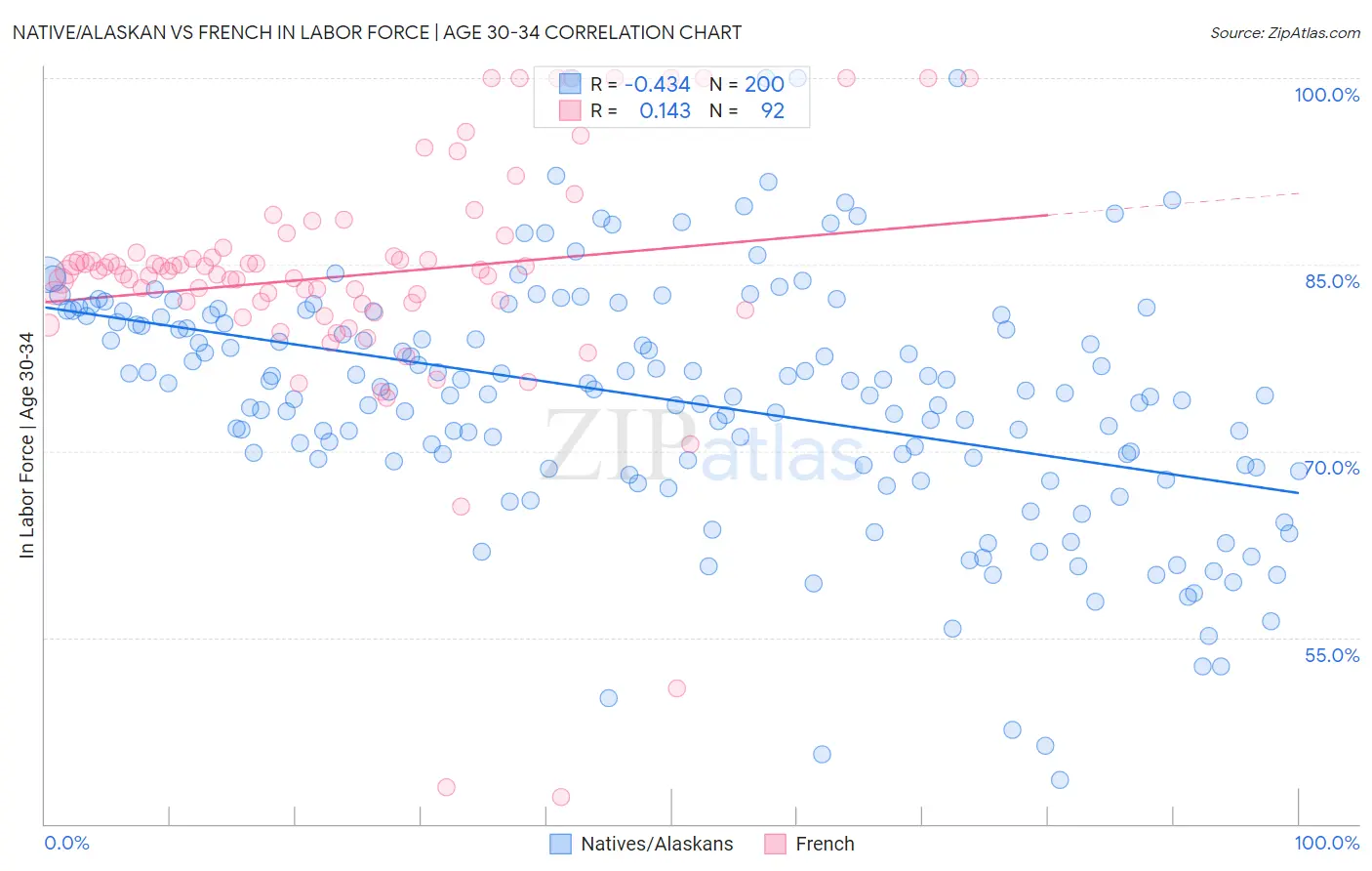 Native/Alaskan vs French In Labor Force | Age 30-34 Correlation Chart