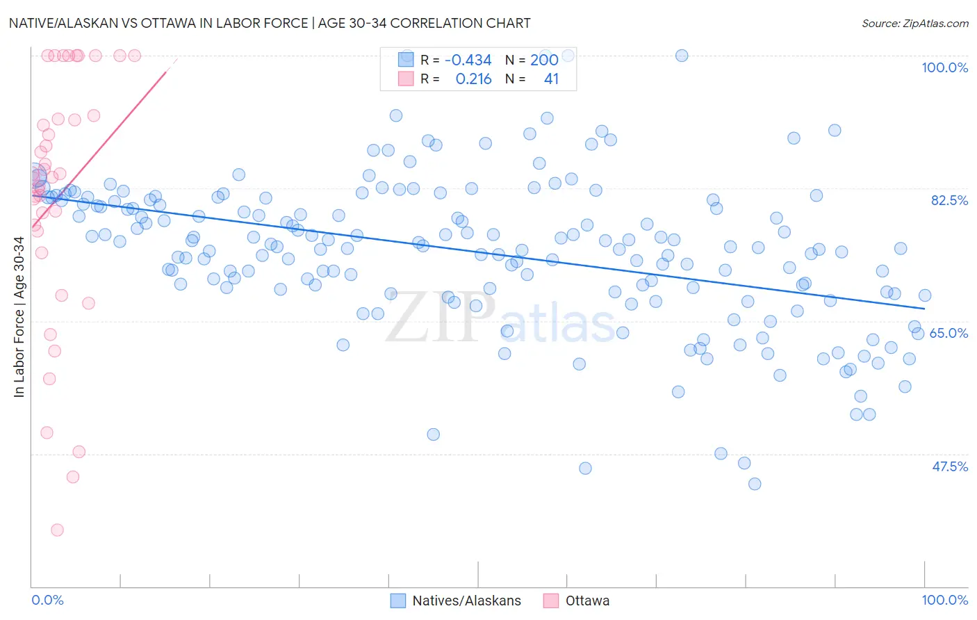 Native/Alaskan vs Ottawa In Labor Force | Age 30-34 Correlation Chart
