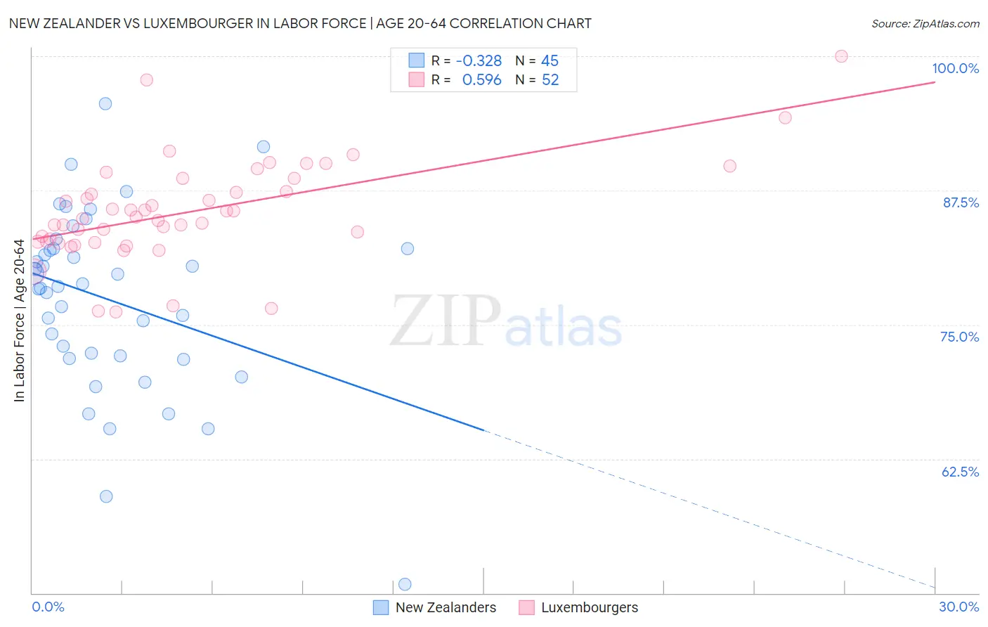 New Zealander vs Luxembourger In Labor Force | Age 20-64 Correlation Chart