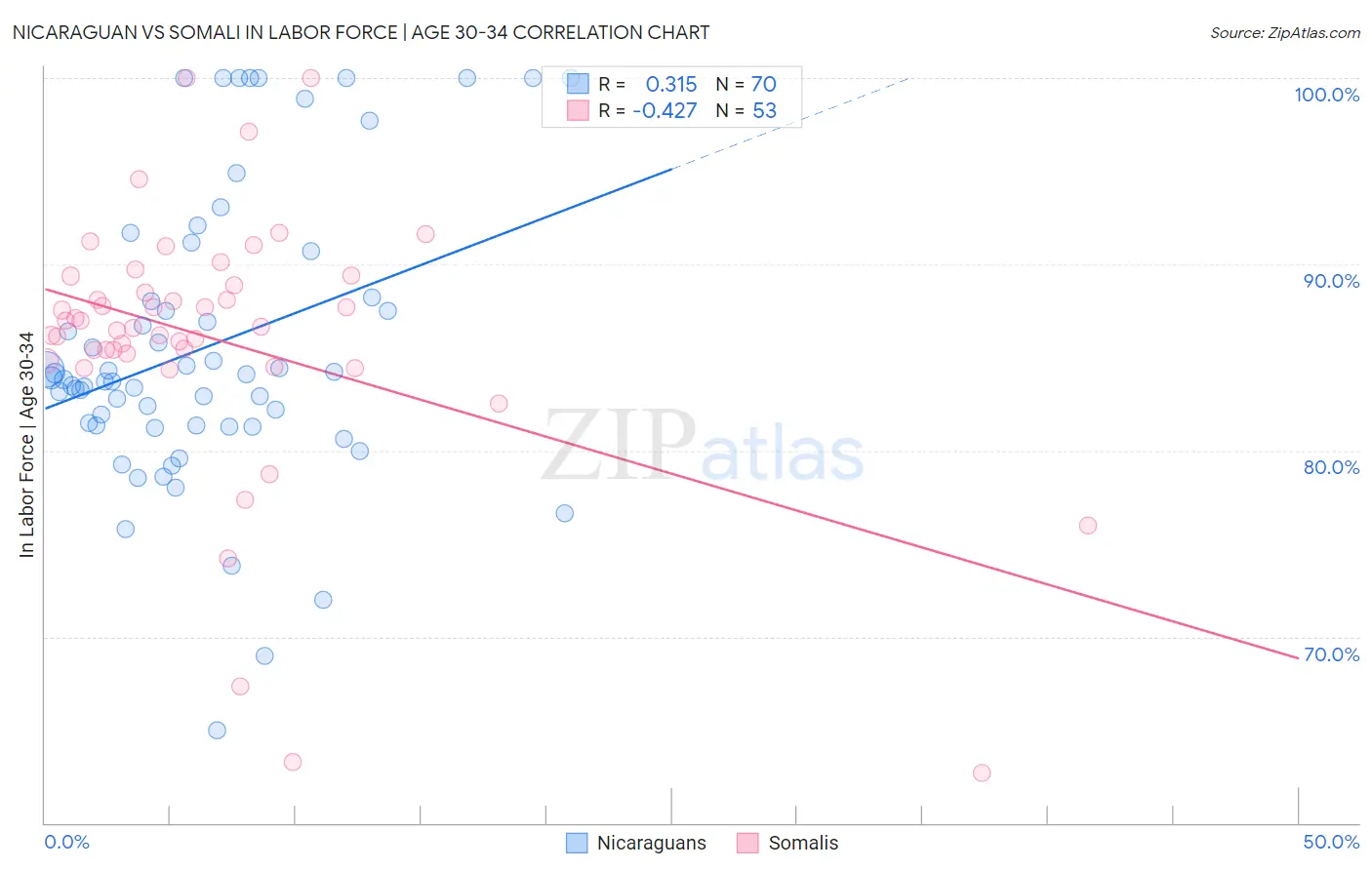 Nicaraguan vs Somali In Labor Force | Age 30-34 Correlation Chart