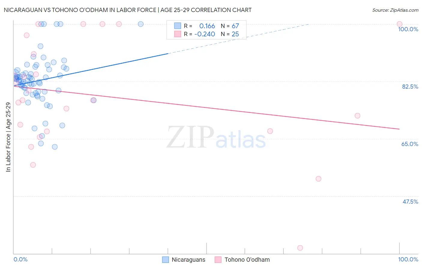 Nicaraguan vs Tohono O'odham In Labor Force | Age 25-29 Correlation Chart