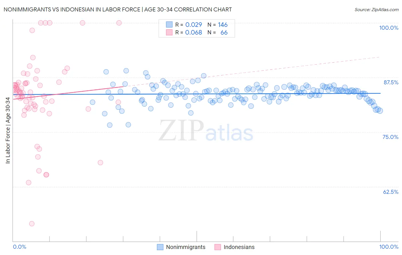 The statistical analysis conducted on geographies consisting of 582,736,501 people shows no correlation between the proportion of Nonimmigrants and labor force participation rate among population between the ages 30 and 34 in the United States with a correlation coefficient (R) of 0.029 and weighted average of 83.5%. Similarly, the statistical analysis conducted on geographies consisting of 162,689,196 people shows a slight positive correlation between the proportion of Indonesians and labor force participation rate among population between the ages 30 and 34 in the United States with a correlation coefficient (R) of 0.068 and weighted average of 84.3%, a difference of 0.96%.