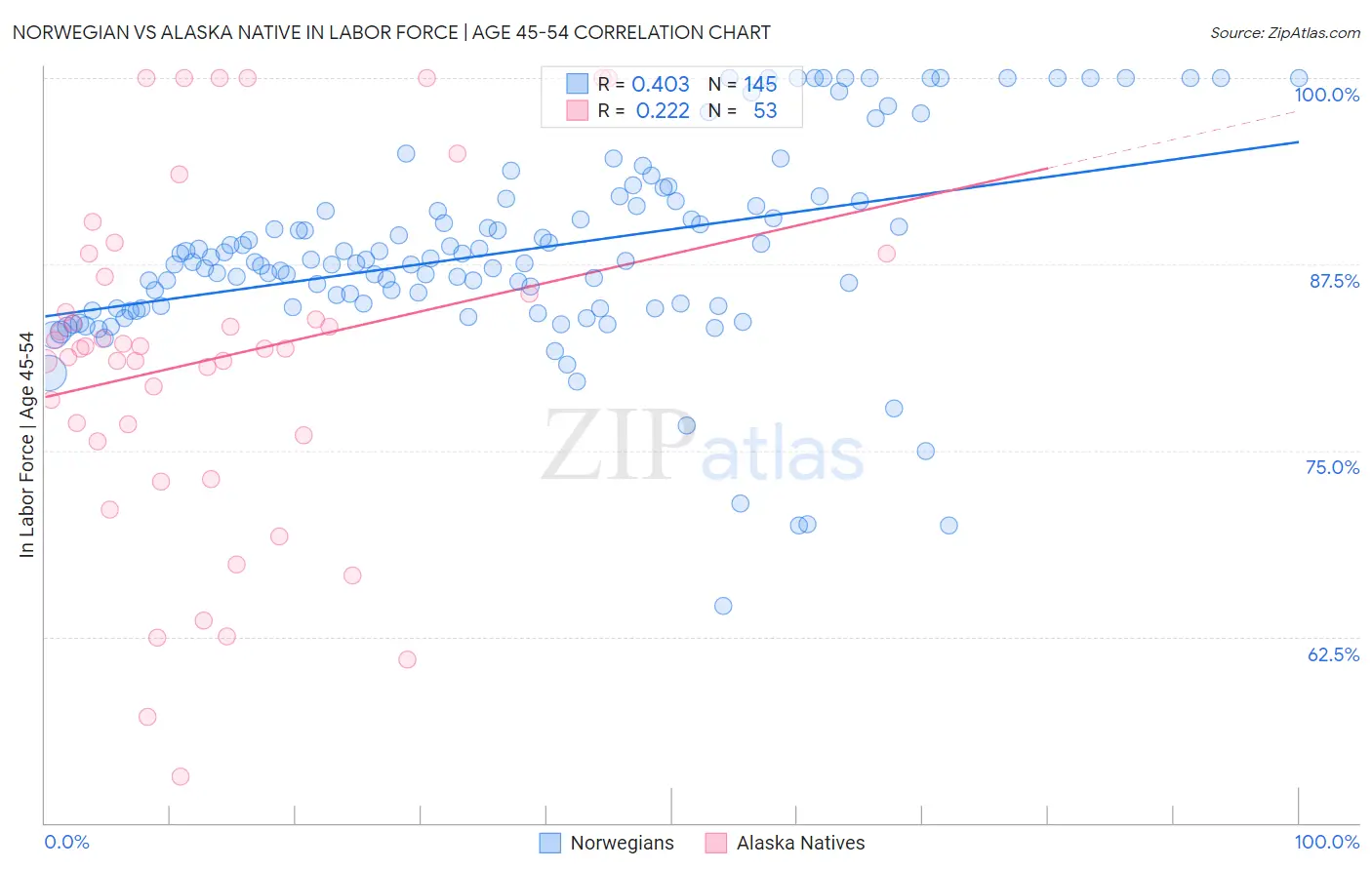 Norwegian vs Alaska Native In Labor Force | Age 45-54 Correlation Chart