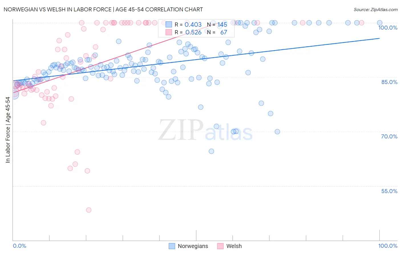 Norwegian vs Welsh In Labor Force | Age 45-54 Correlation Chart