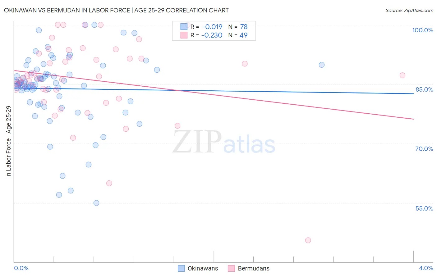 The statistical analysis conducted on geographies consisting of 73,774,164 people shows no correlation between the proportion of Okinawans and labor force participation rate among population between the ages 25 and 29 in the United States with a correlation coefficient (R) of -0.019 and weighted average of 85.2%. Similarly, the statistical analysis conducted on geographies consisting of 55,723,505 people shows a weak negative correlation between the proportion of Bermudans and labor force participation rate among population between the ages 25 and 29 in the United States with a correlation coefficient (R) of -0.230 and weighted average of 86.0%, a difference of 1.0%.