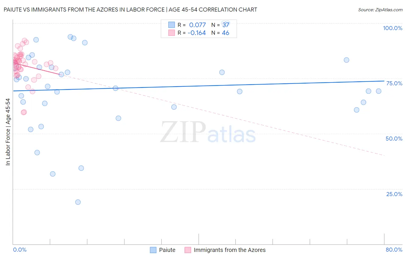 Paiute vs Immigrants from the Azores In Labor Force | Age 45-54 Correlation Chart