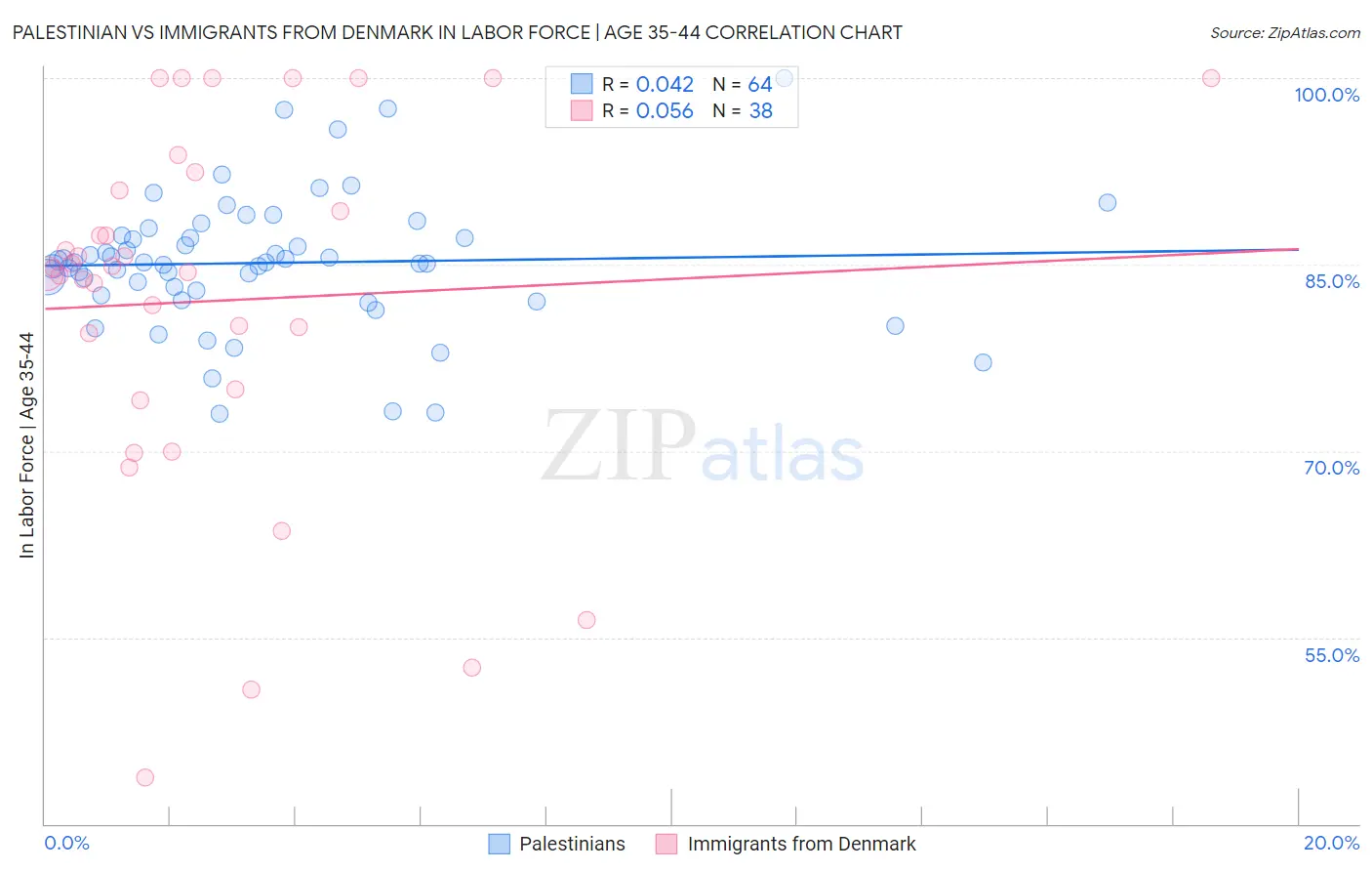 Palestinian vs Immigrants from Denmark In Labor Force | Age 35-44 Correlation Chart