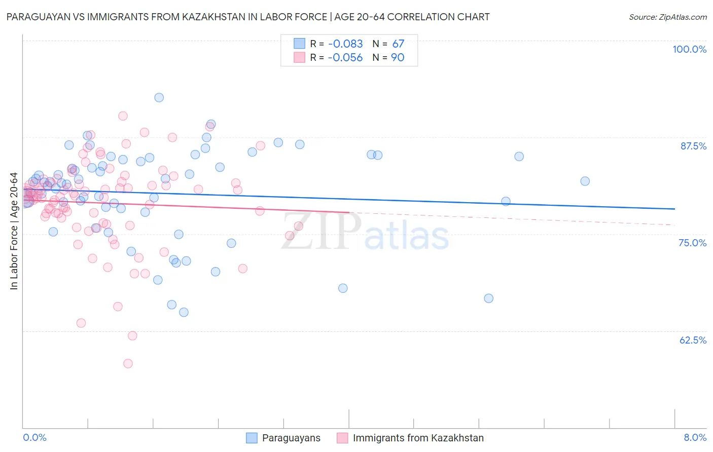 Paraguayan vs Immigrants from Kazakhstan In Labor Force | Age 20-64 Correlation Chart