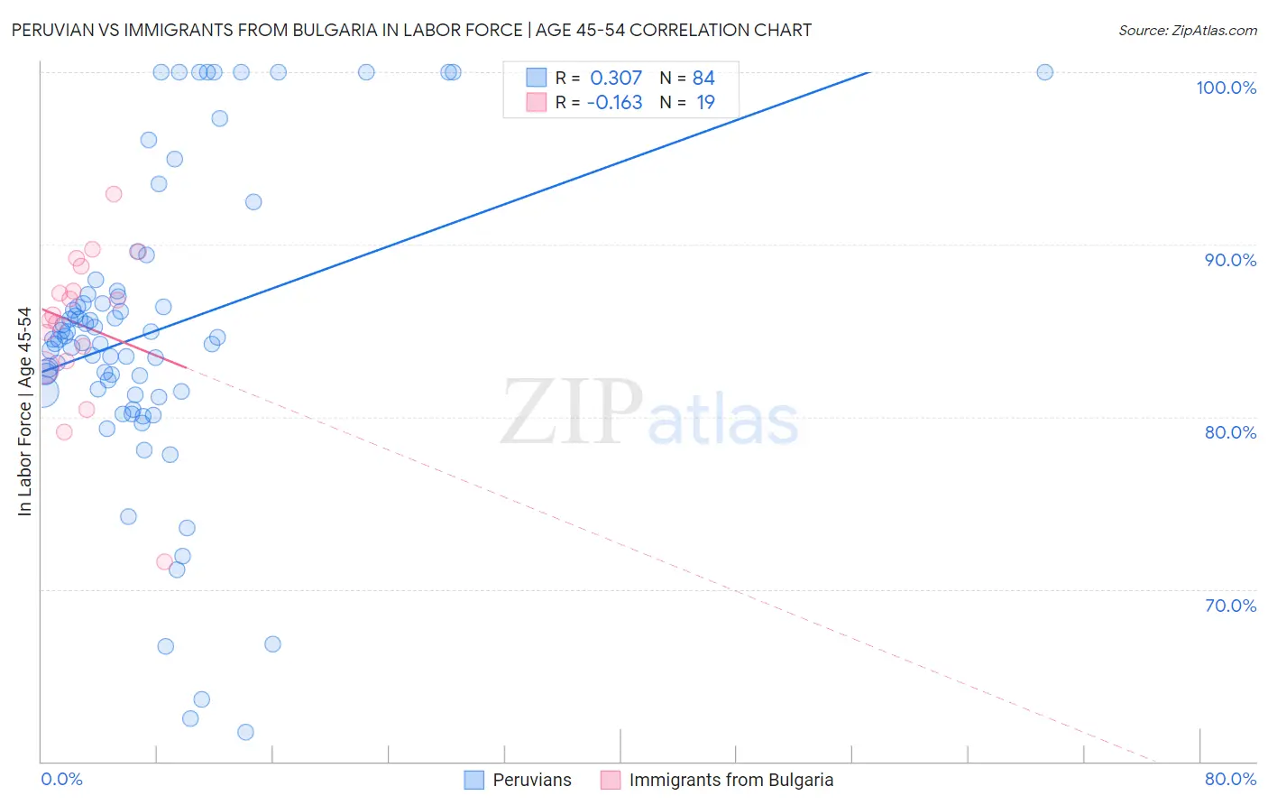 Peruvian vs Immigrants from Bulgaria In Labor Force | Age 45-54 Correlation Chart