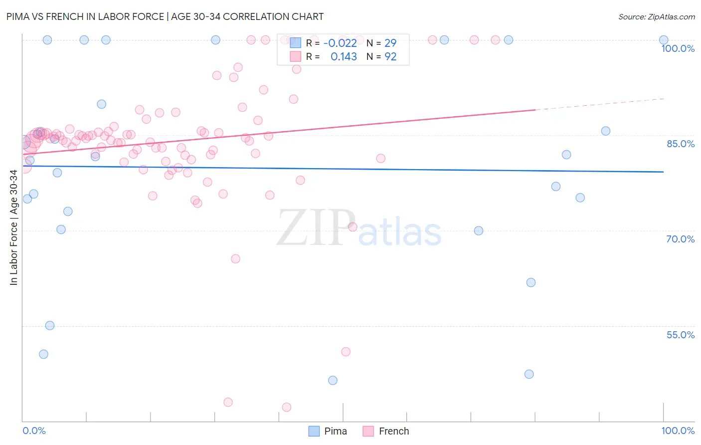 The statistical analysis conducted on geographies consisting of 61,528,436 people shows no correlation between the proportion of Pima and labor force participation rate among population between the ages 30 and 34 in the United States with a correlation coefficient (R) of -0.022 and weighted average of 79.0%. Similarly, the statistical analysis conducted on geographies consisting of 571,091,805 people shows a poor positive correlation between the proportion of French and labor force participation rate among population between the ages 30 and 34 in the United States with a correlation coefficient (R) of 0.143 and weighted average of 84.4%, a difference of 6.8%.