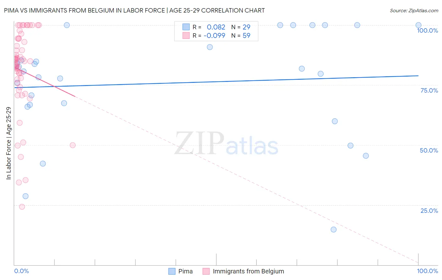 Pima vs Immigrants from Belgium In Labor Force | Age 25-29 Correlation Chart