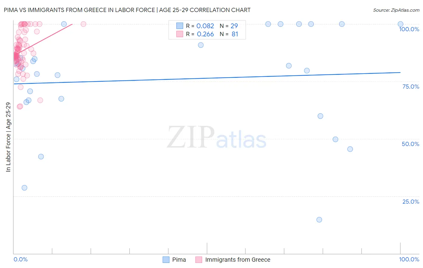 Pima vs Immigrants from Greece In Labor Force | Age 25-29 Correlation Chart