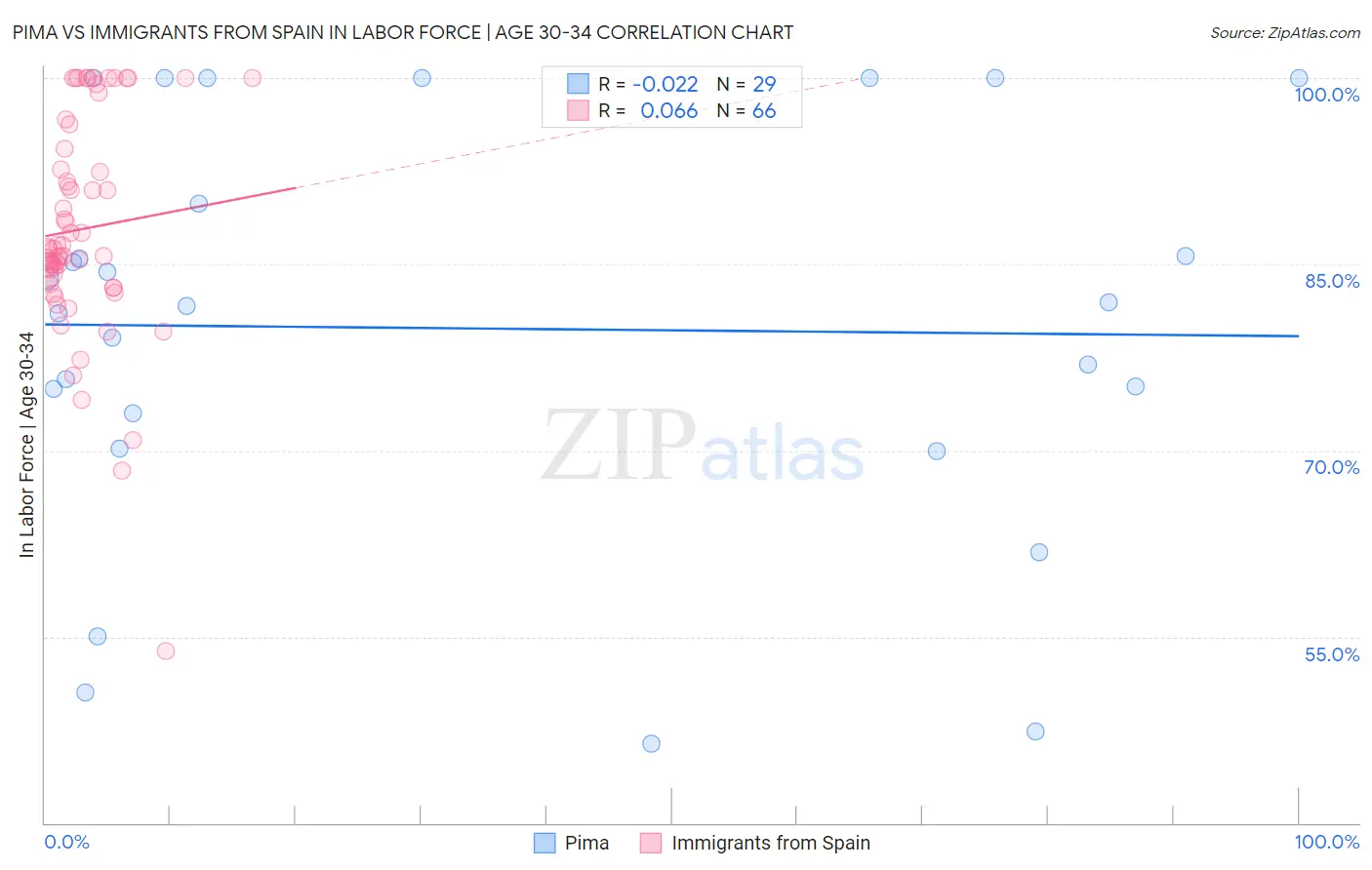 Pima vs Immigrants from Spain In Labor Force | Age 30-34 Correlation Chart