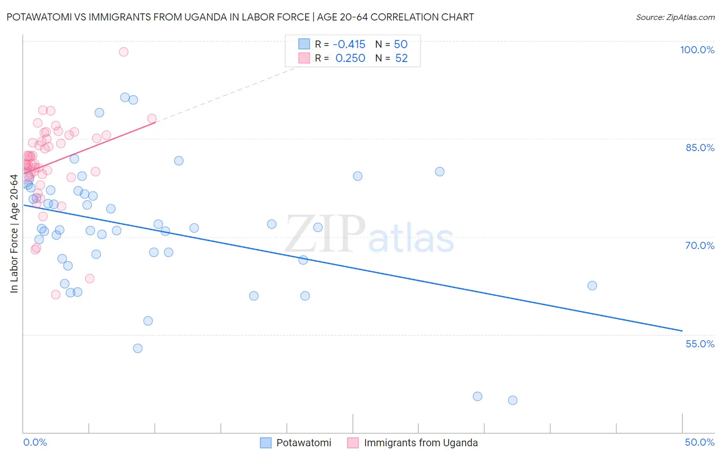 Potawatomi vs Immigrants from Uganda In Labor Force | Age 20-64 Correlation Chart
