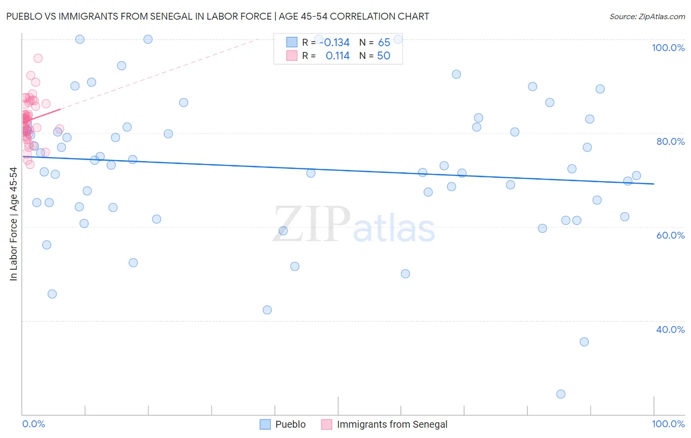 Pueblo vs Immigrants from Senegal In Labor Force | Age 45-54 Correlation Chart