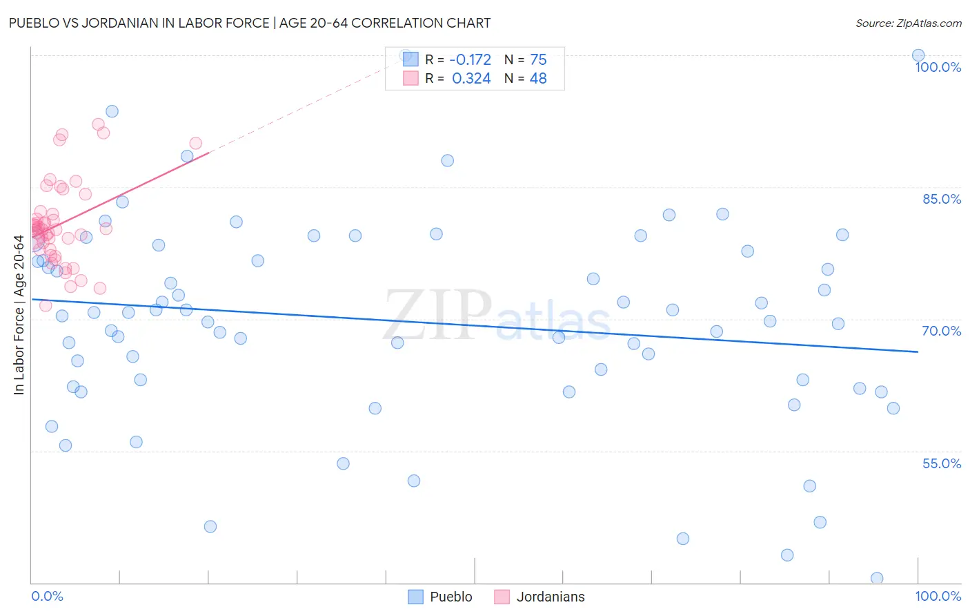 Pueblo vs Jordanian In Labor Force | Age 20-64 Correlation Chart