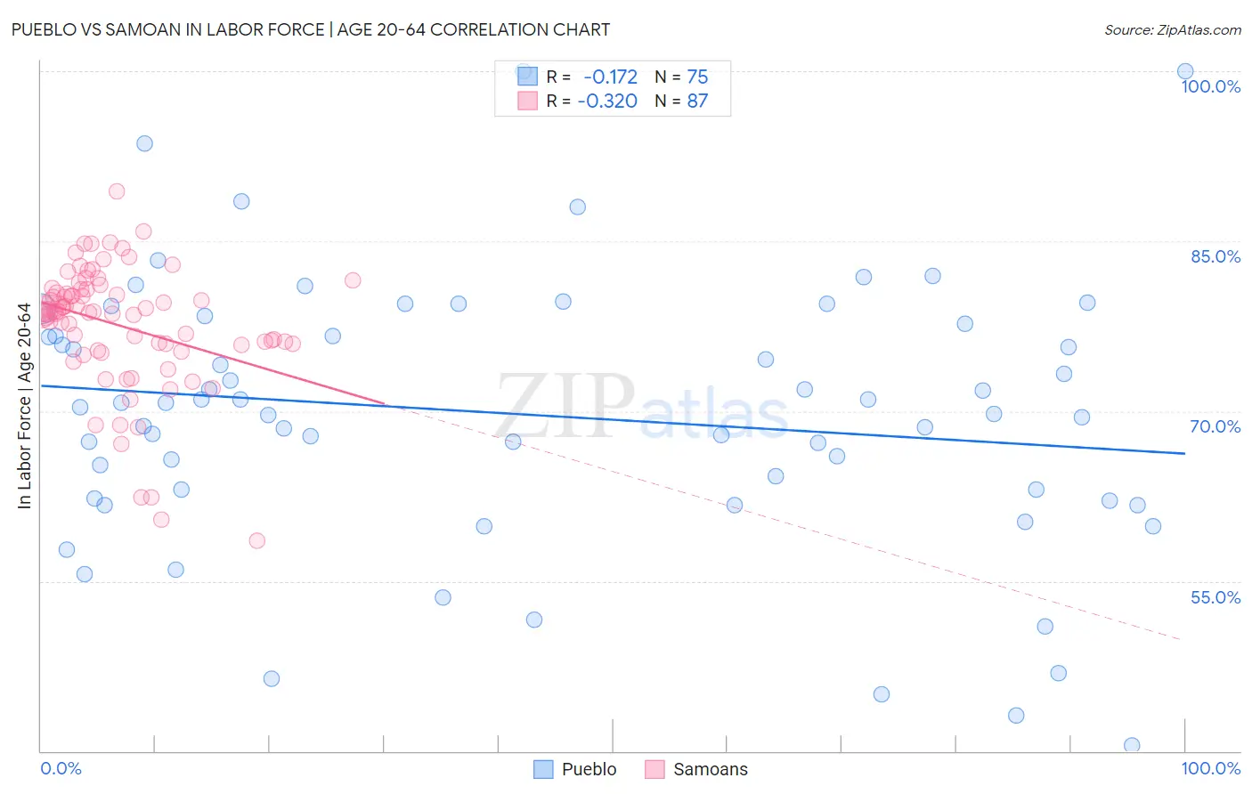 Pueblo vs Samoan In Labor Force | Age 20-64 Correlation Chart