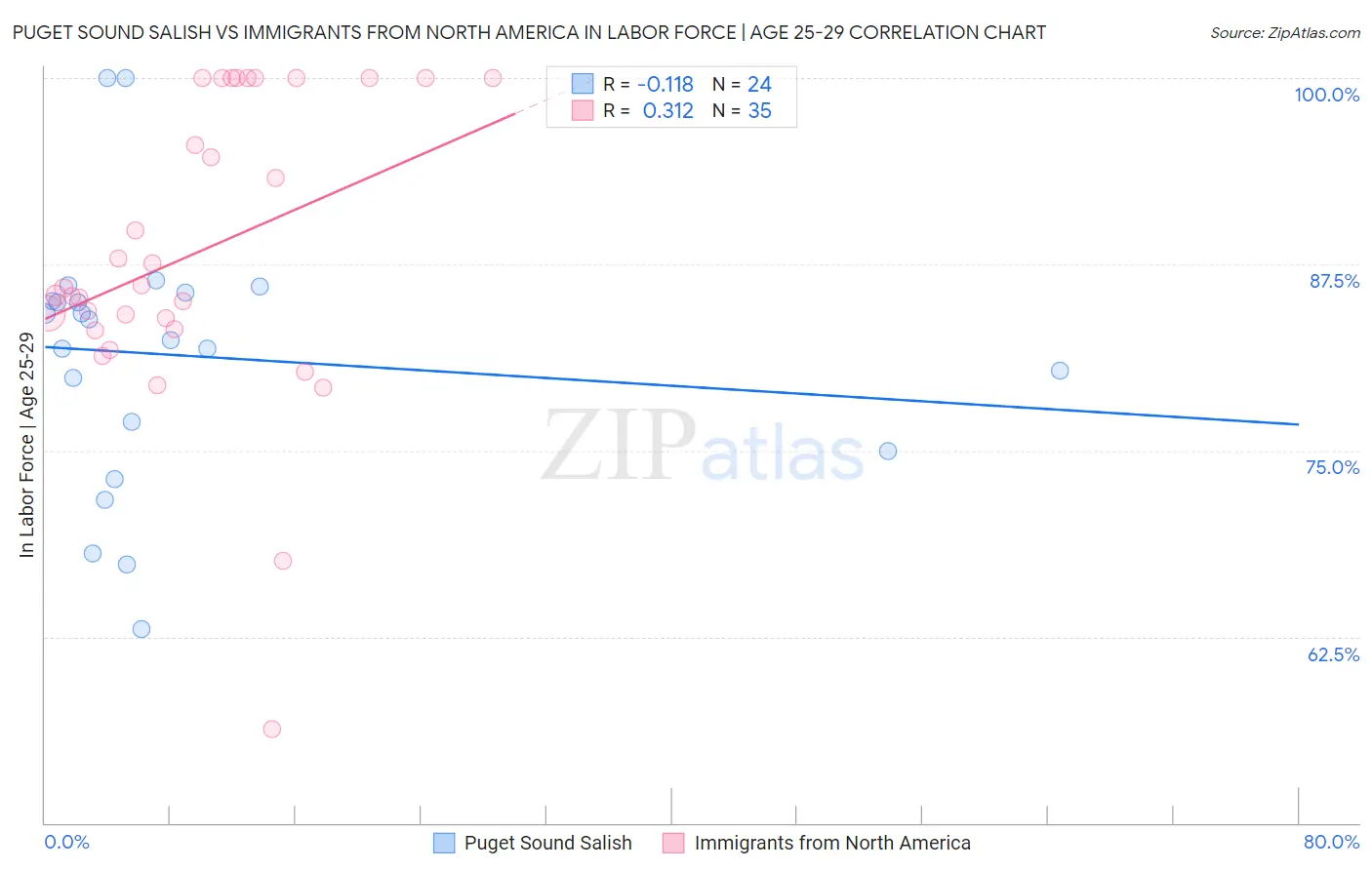 Puget Sound Salish vs Immigrants from North America In Labor Force | Age 25-29 Correlation Chart