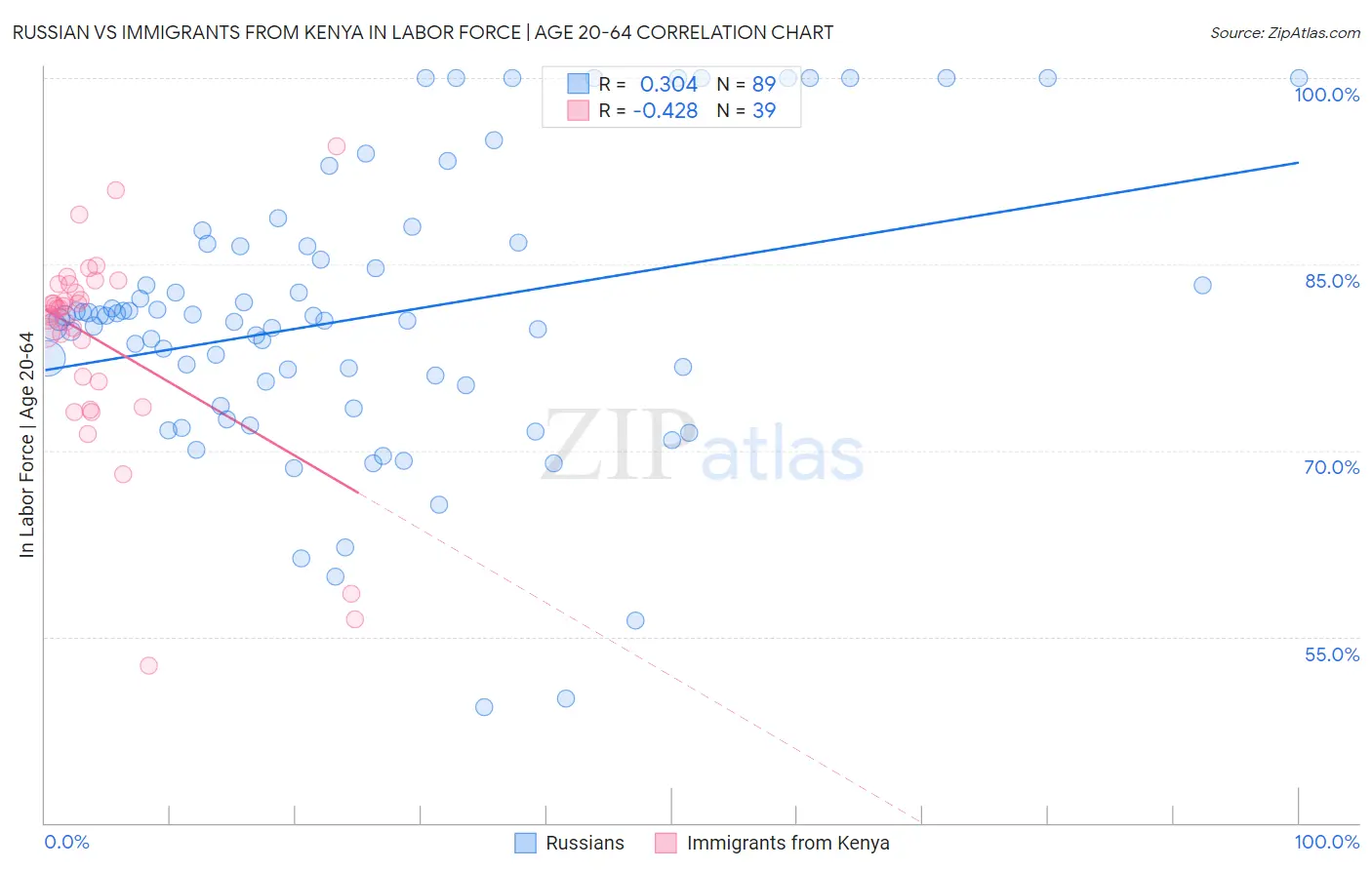 Russian vs Immigrants from Kenya In Labor Force | Age 20-64 Correlation Chart