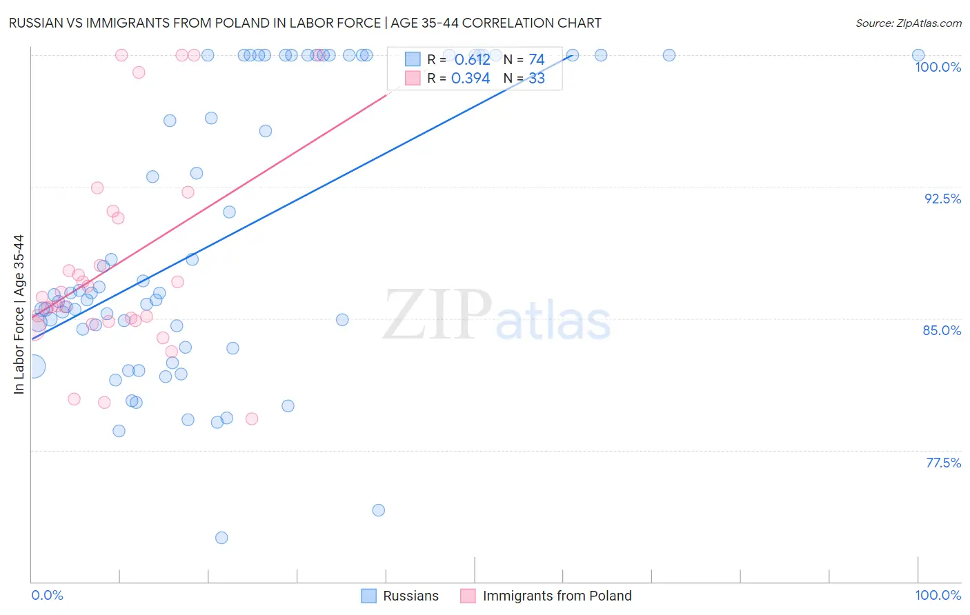 Russian vs Immigrants from Poland In Labor Force | Age 35-44 Correlation Chart