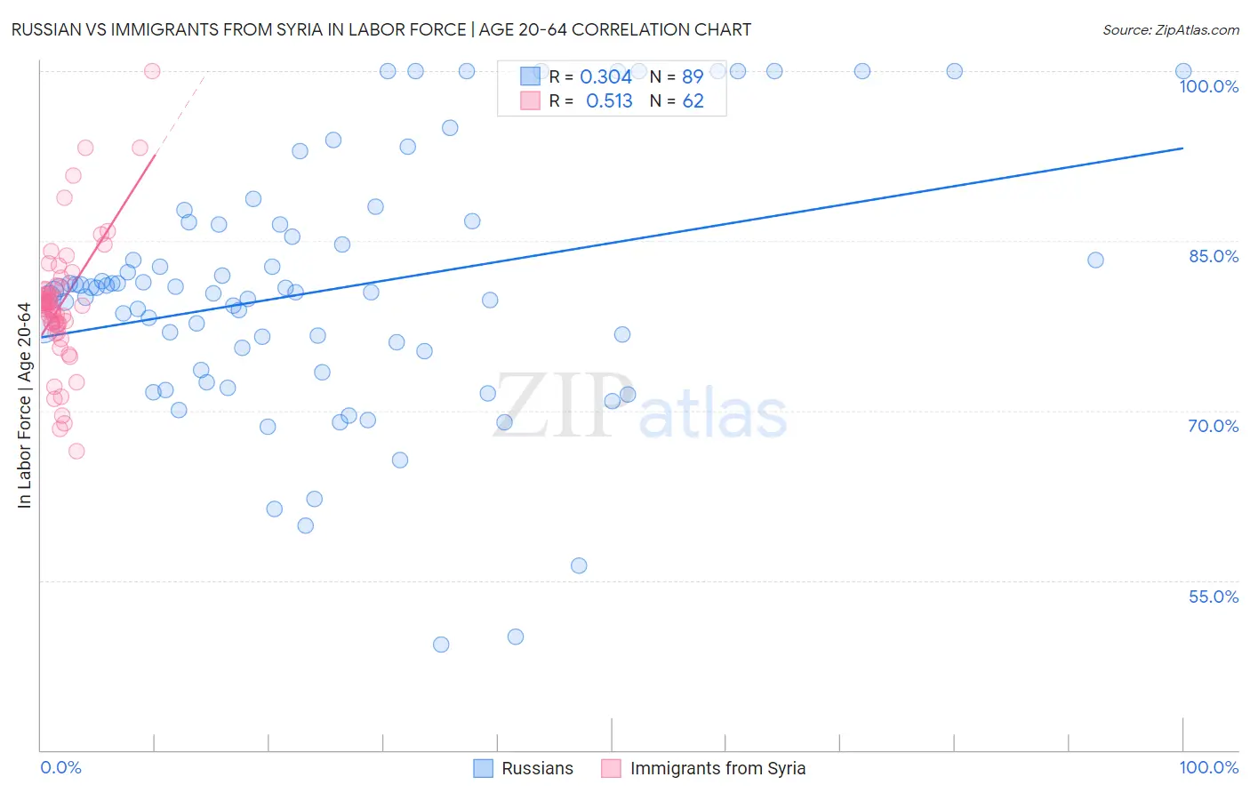 Russian vs Immigrants from Syria In Labor Force | Age 20-64 Correlation Chart