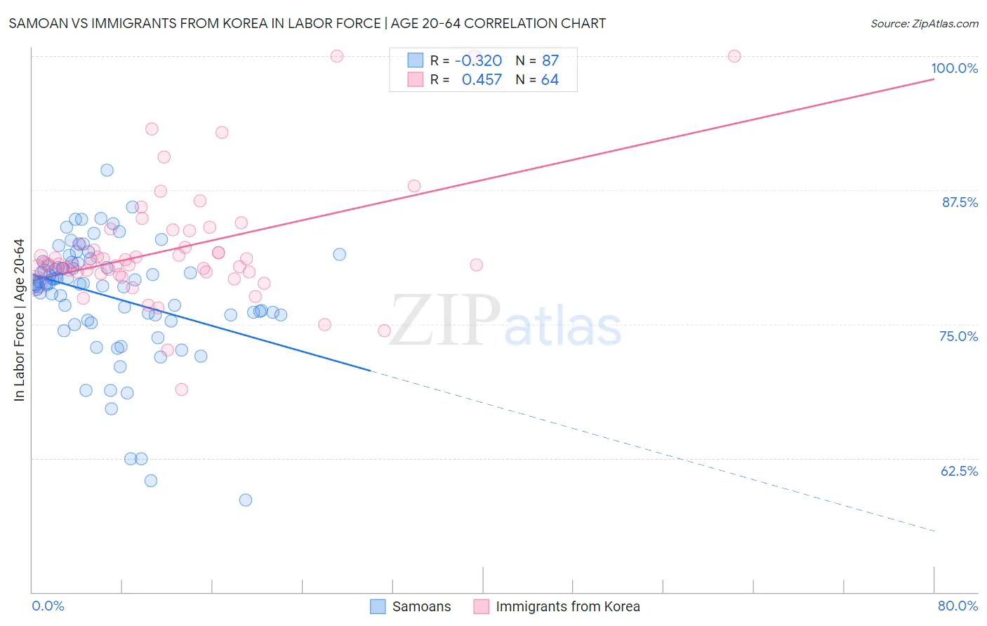 Samoan vs Immigrants from Korea In Labor Force | Age 20-64 Correlation Chart