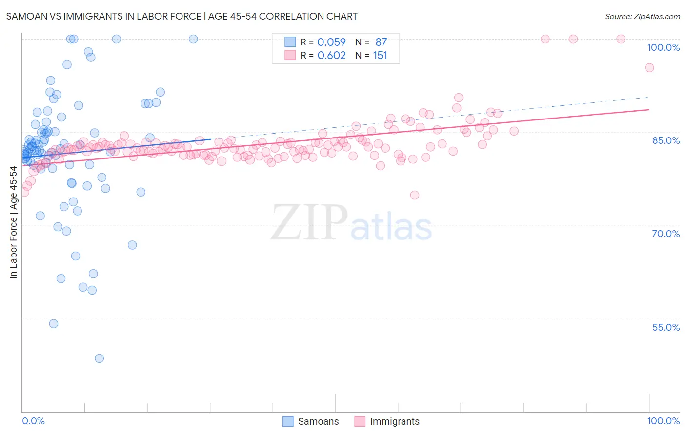 Samoan vs Immigrants In Labor Force | Age 45-54 Correlation Chart