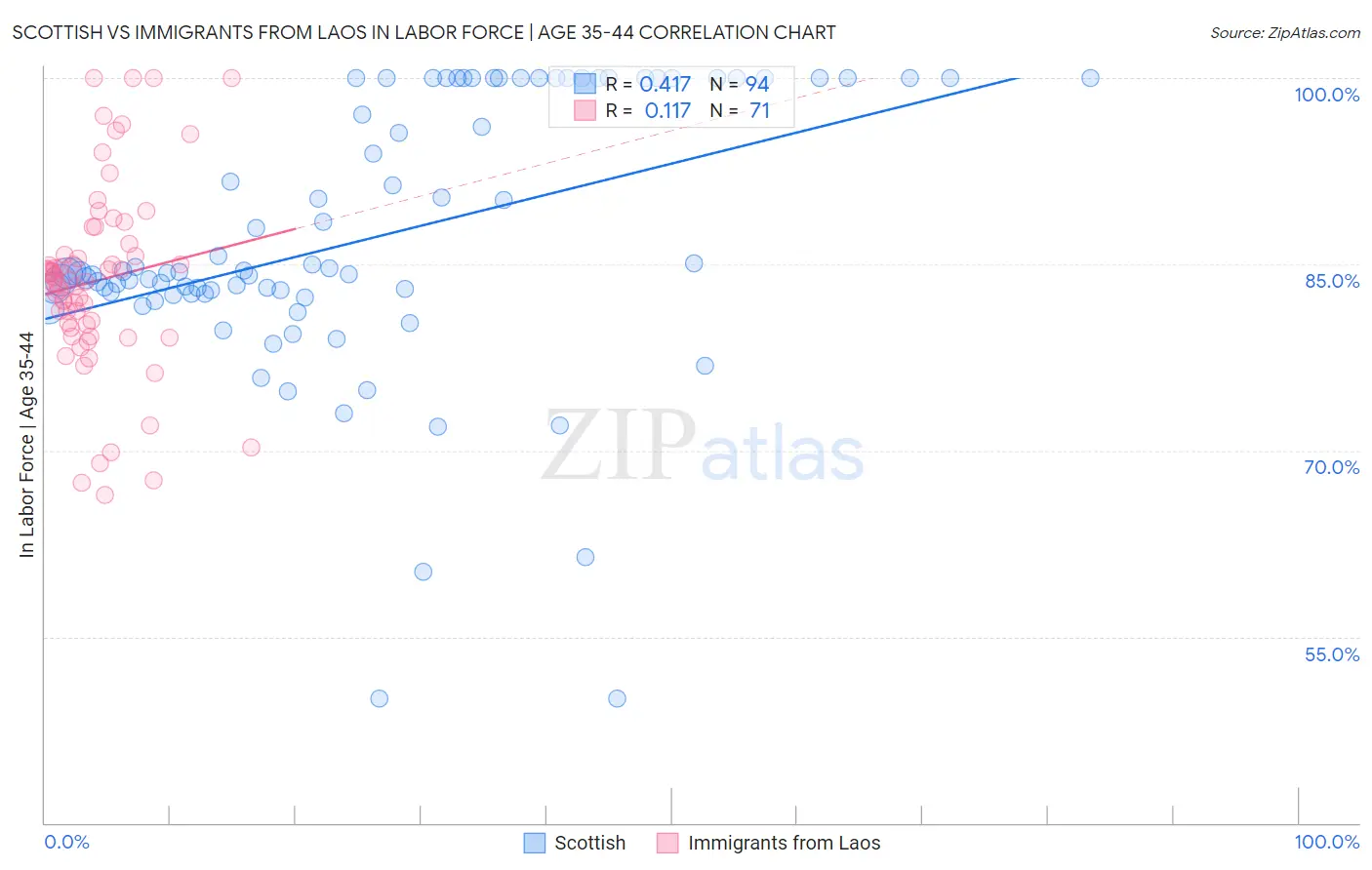 Scottish vs Immigrants from Laos In Labor Force | Age 35-44 Correlation Chart