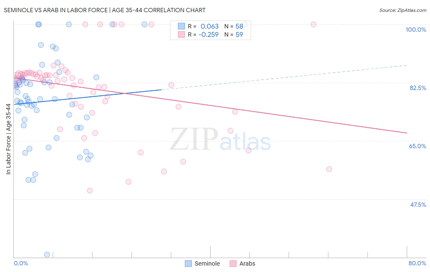 Seminole vs Arab In Labor Force | Age 35-44 Correlation Chart