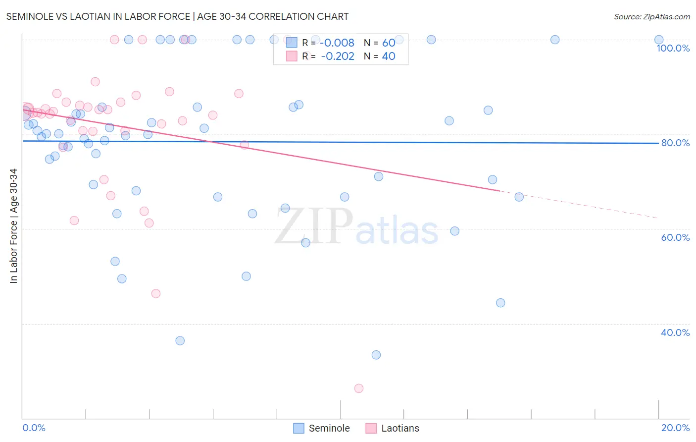 Seminole vs Laotian In Labor Force | Age 30-34 Correlation Chart