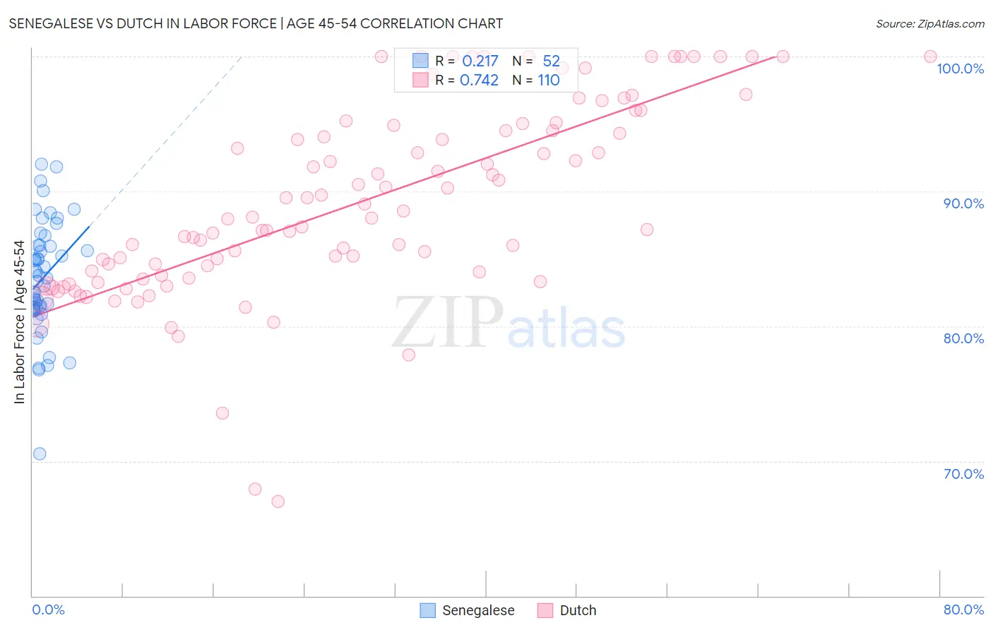 Senegalese vs Dutch In Labor Force | Age 45-54 Correlation Chart