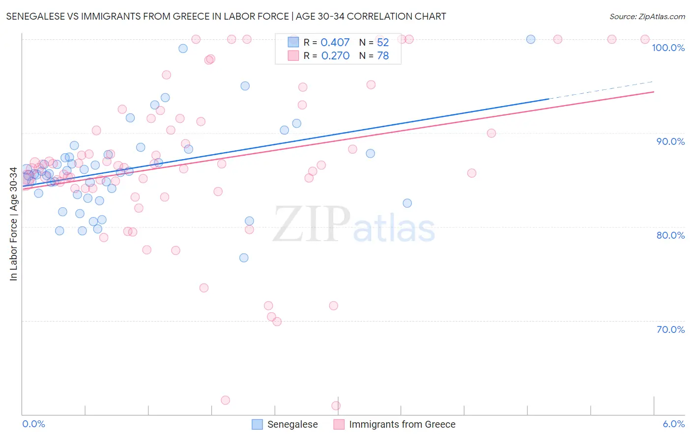 Senegalese vs Immigrants from Greece In Labor Force | Age 30-34 Correlation Chart