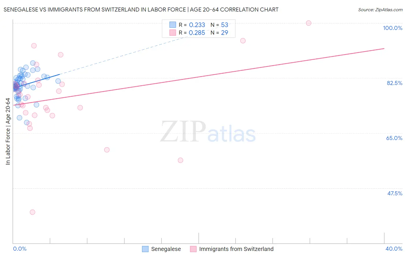 Senegalese vs Immigrants from Switzerland In Labor Force | Age 20-64 Correlation Chart