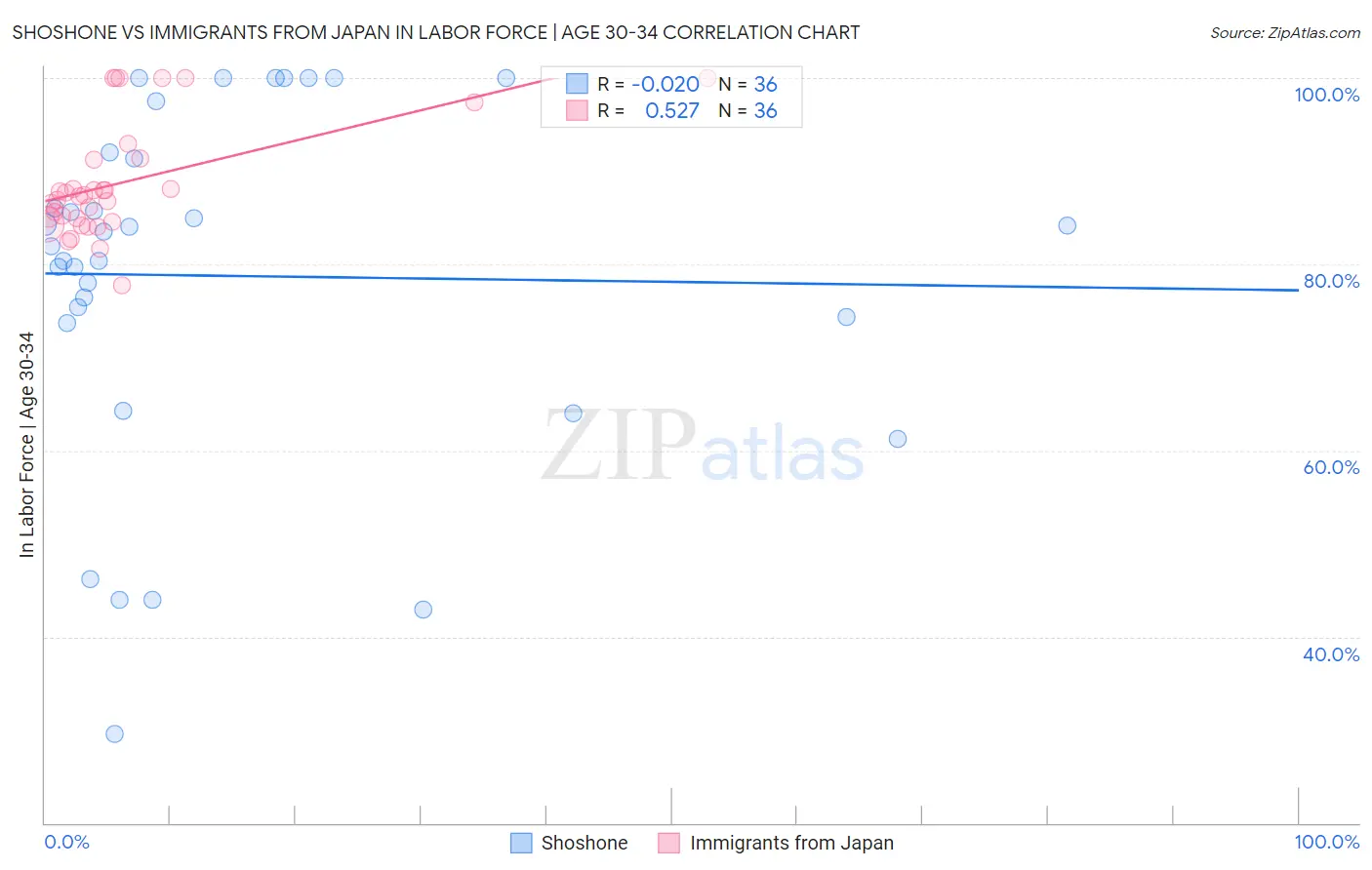 Shoshone vs Immigrants from Japan In Labor Force | Age 30-34 Correlation Chart