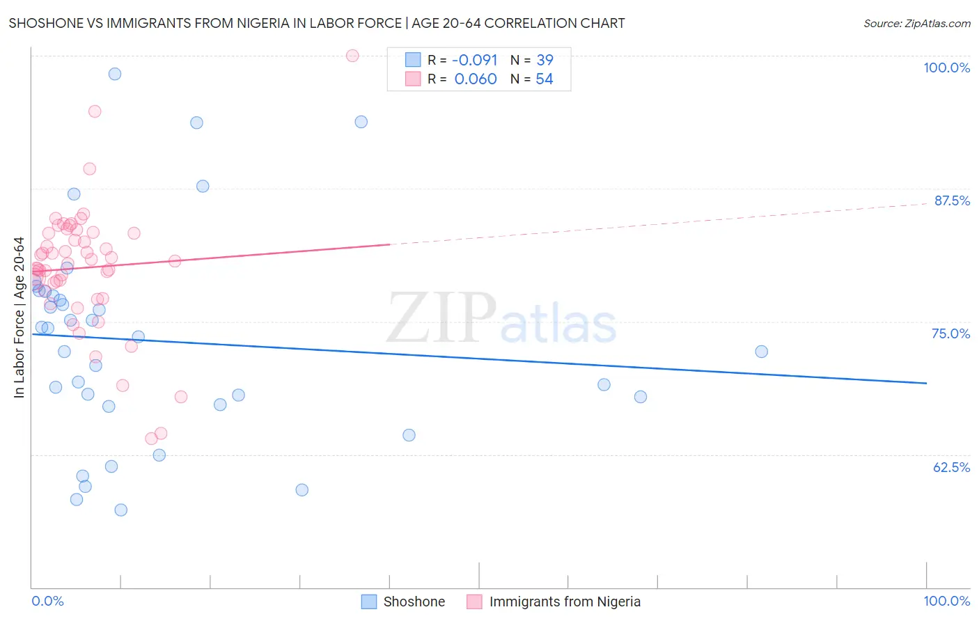 Shoshone vs Immigrants from Nigeria In Labor Force | Age 20-64 Correlation Chart