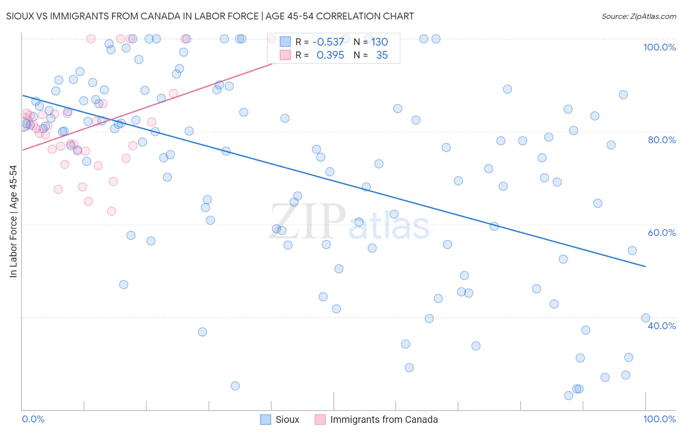 Sioux vs Immigrants from Canada In Labor Force | Age 45-54 Correlation Chart