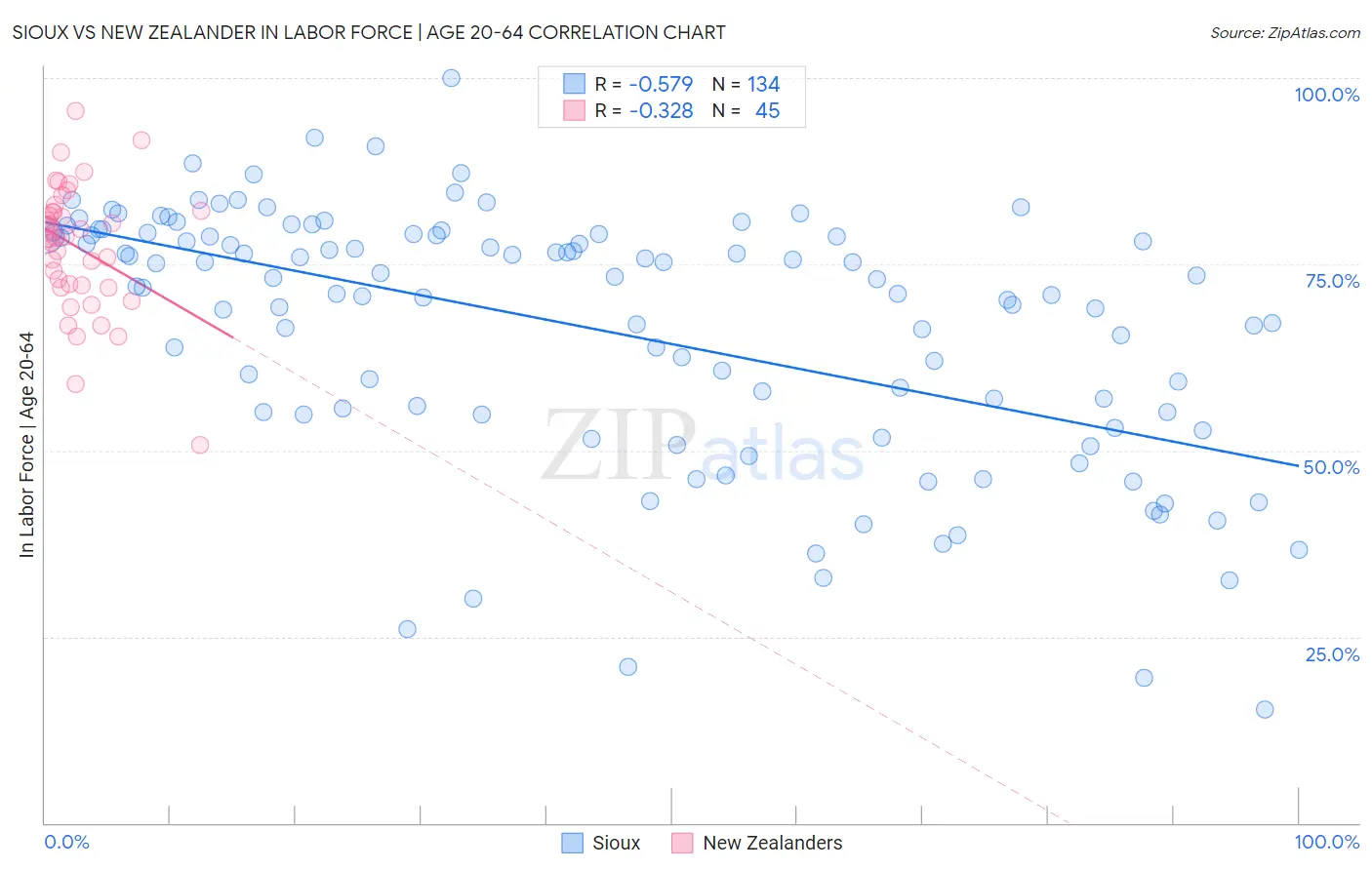 Sioux vs New Zealander In Labor Force | Age 20-64 Correlation Chart