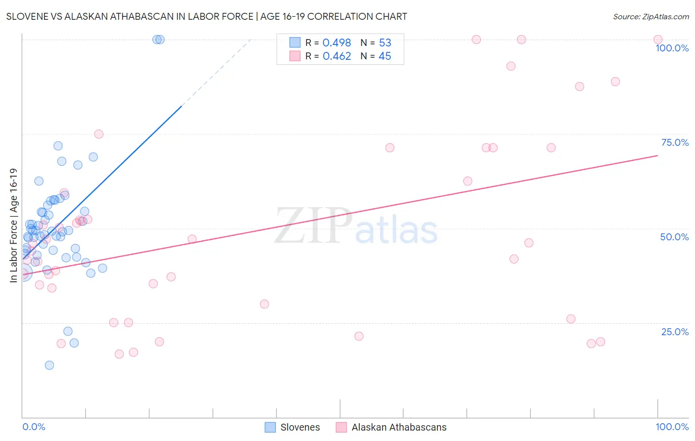 Slovene vs Alaskan Athabascan In Labor Force | Age 16-19 Correlation Chart