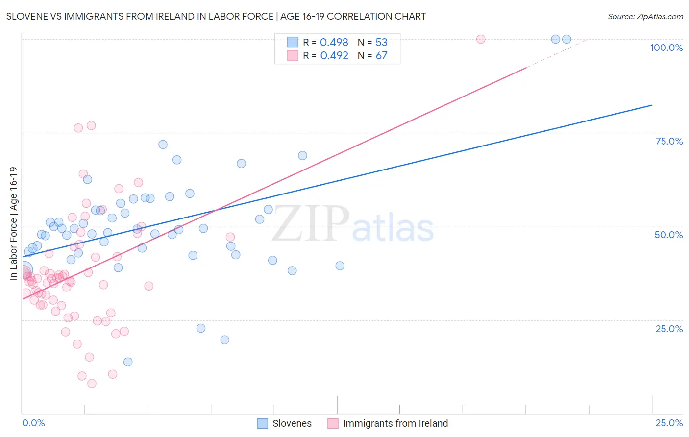 Slovene vs Immigrants from Ireland In Labor Force | Age 16-19 Correlation Chart