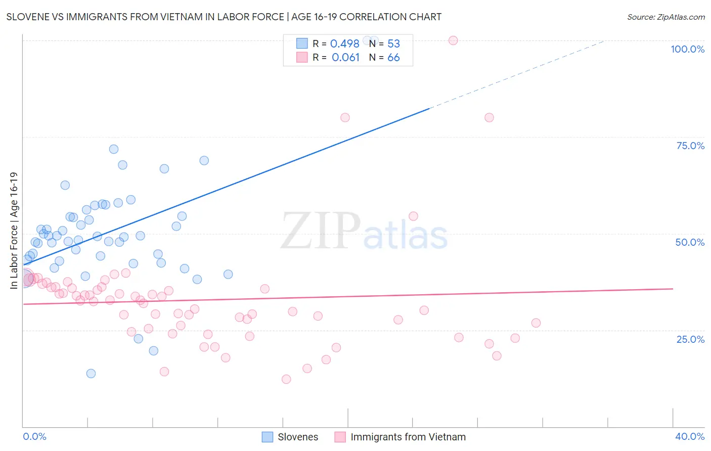 Slovene vs Immigrants from Vietnam In Labor Force | Age 16-19 Correlation Chart