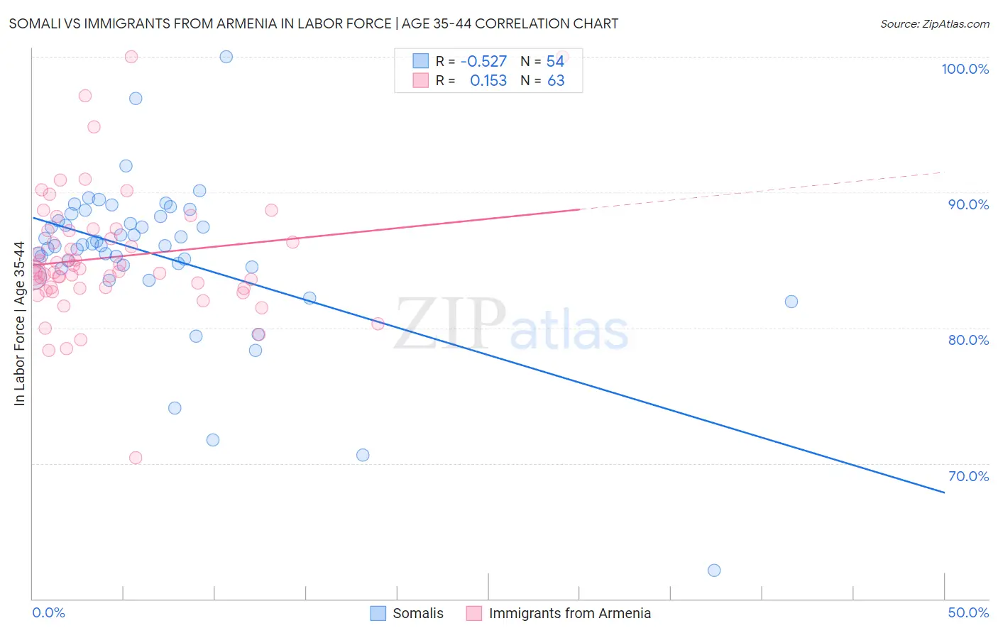 Somali vs Immigrants from Armenia In Labor Force | Age 35-44 Correlation Chart