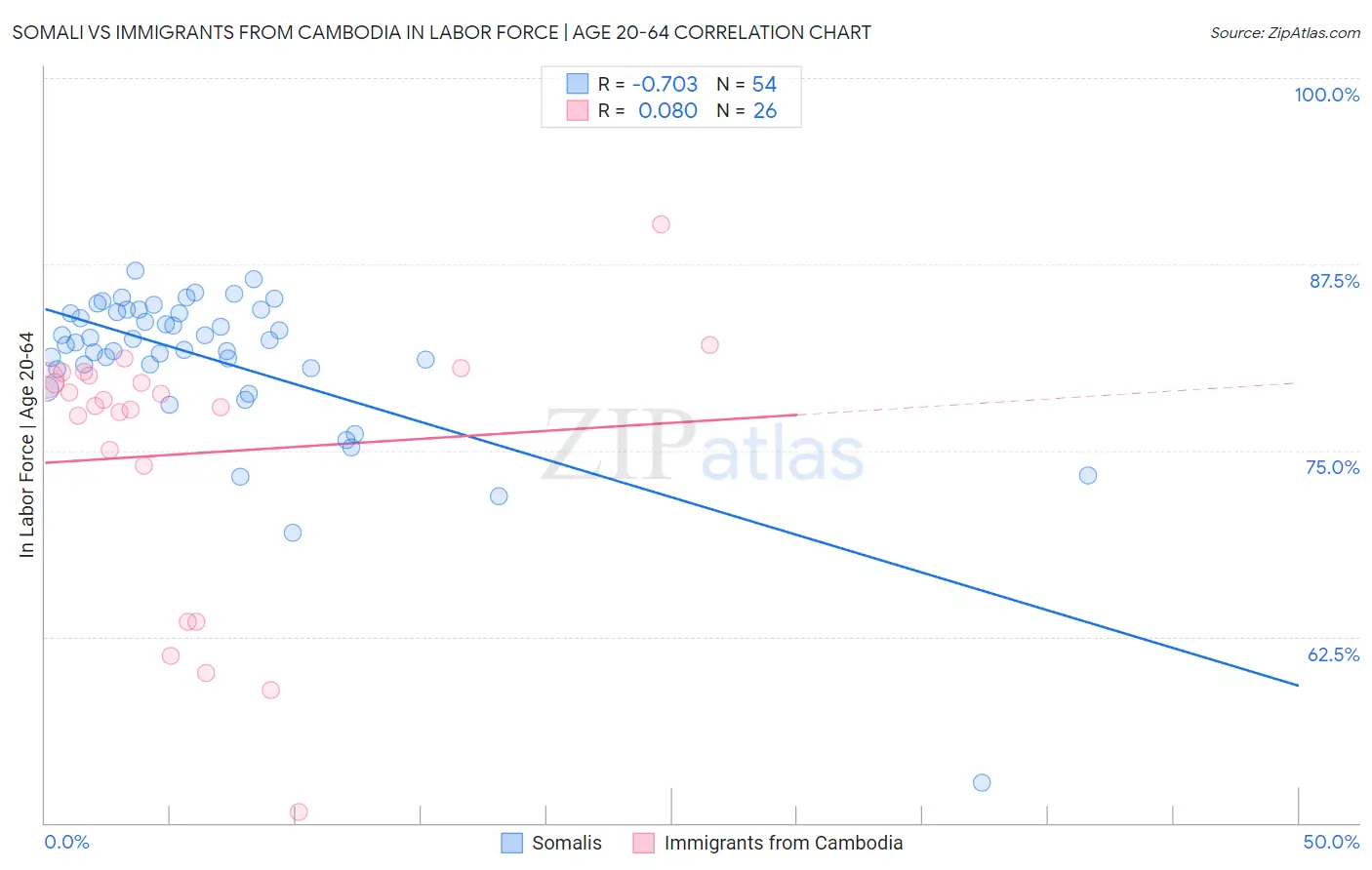 Somali vs Immigrants from Cambodia In Labor Force | Age 20-64 Correlation Chart